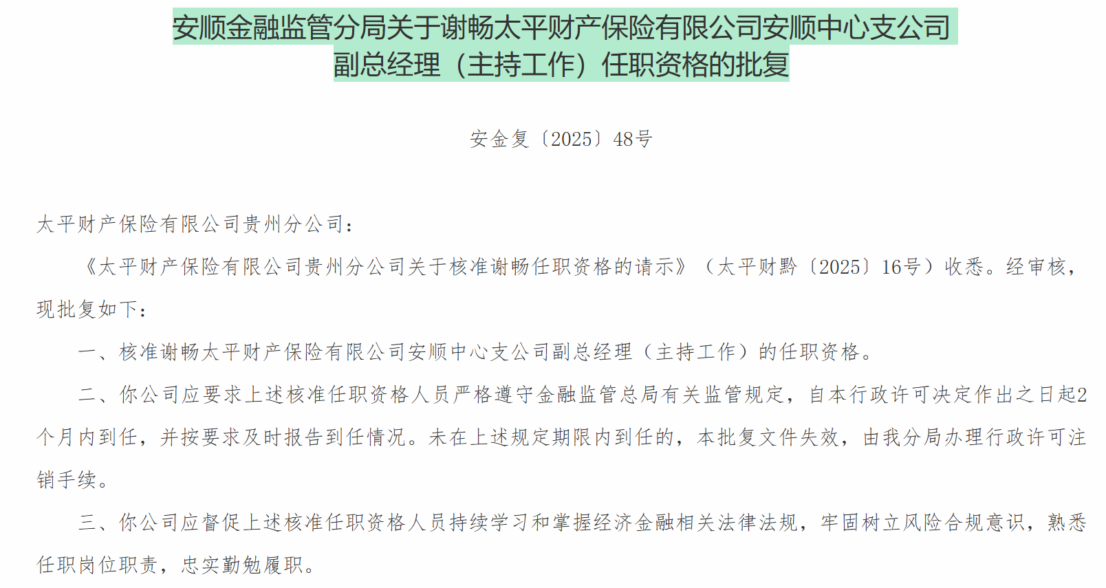 12月26日,安顺金融监管分局发布关于谢畅太平财产保险有限公司安顺中心支公司副总经理(主持工作)任职资格的批复,核准谢畅太平财产保险有限公司安顺中心支公司副总经理(主持工作)的任职资格。